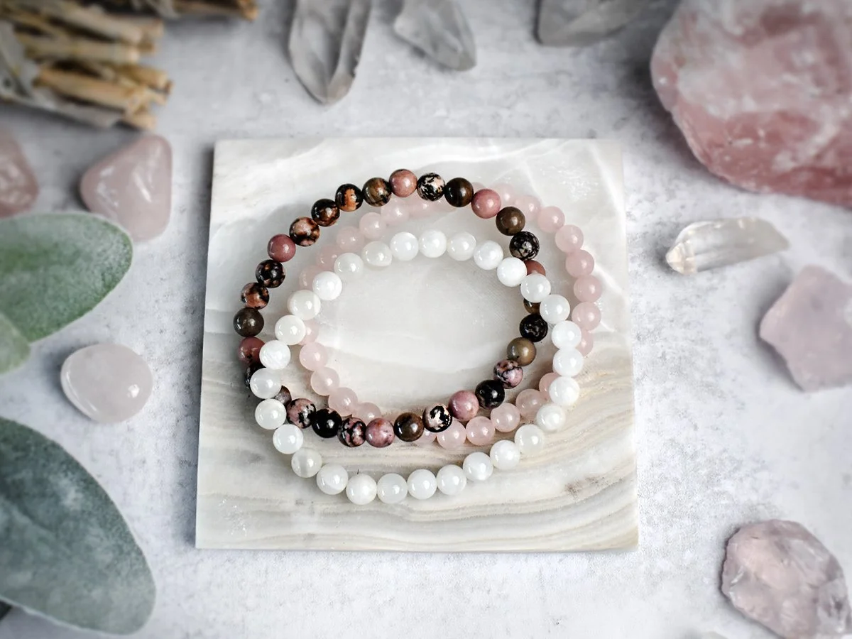 June’s birthstone, Moonstone, is treasured for its luminous beauty and deep connection to intuition and the feminine energy. This month, I have paired White Moonstone with Rhodonite and Rose Quartz, creating a gentle trio that supports emotional healing, self-love, and a deeper connection to the heart.